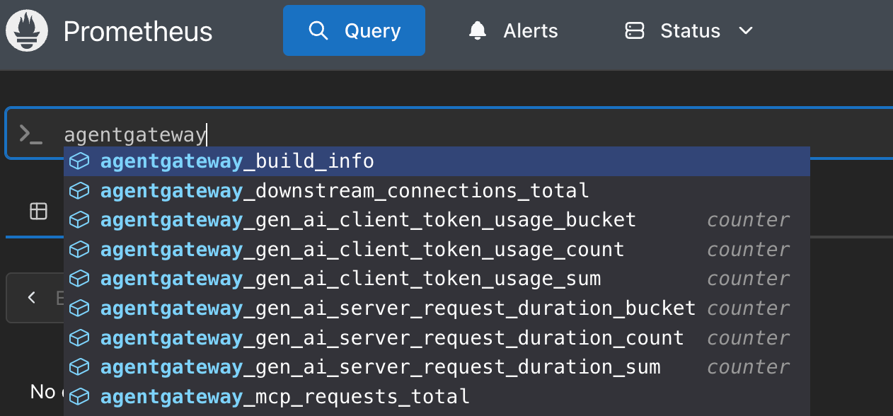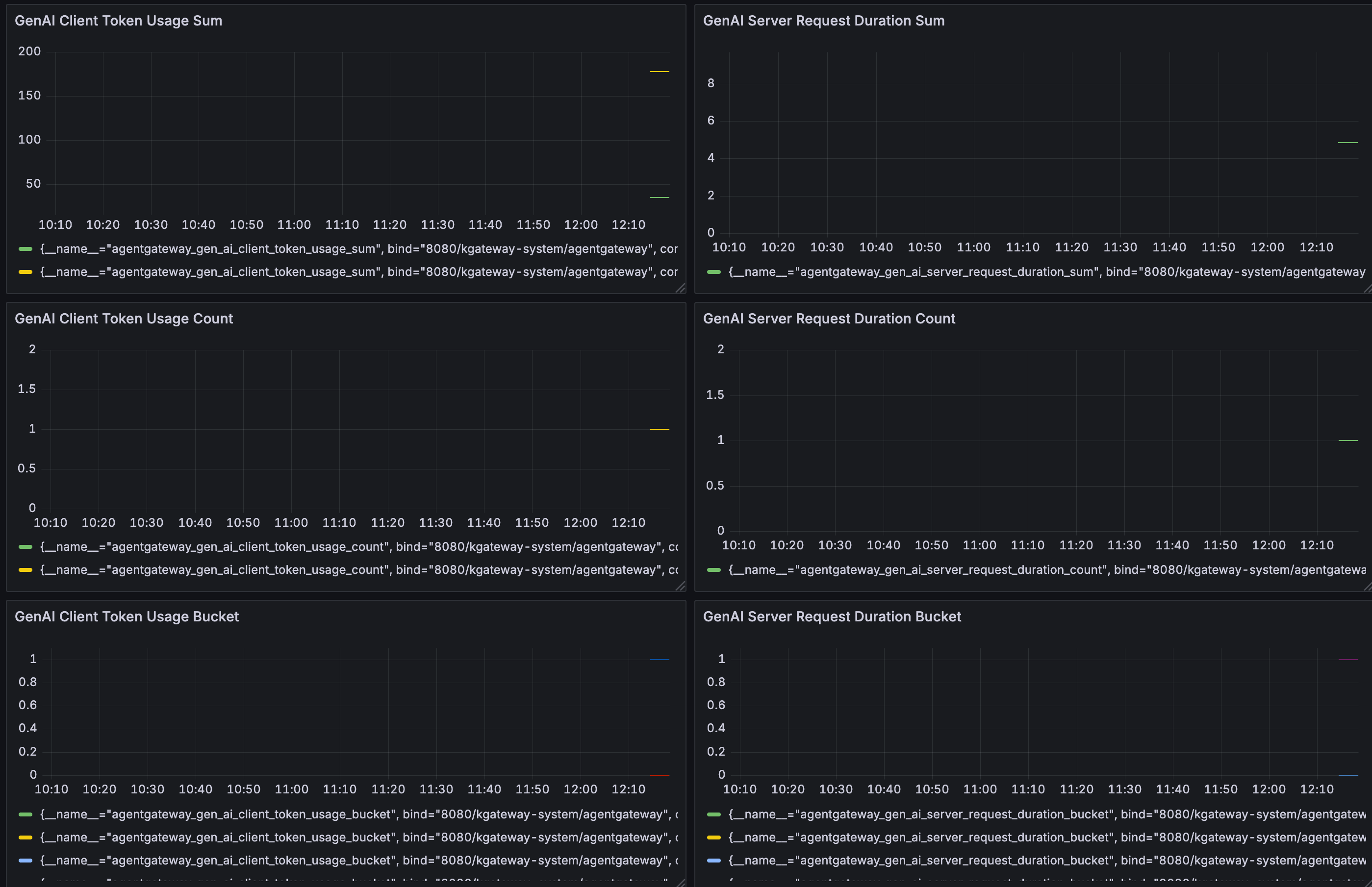 Agentgateway has a wealth of metrics about LLM usage. The important point here is that the metric dimensions are fully configurable. Let’s take a look. Here are the main metrics that get tracked: