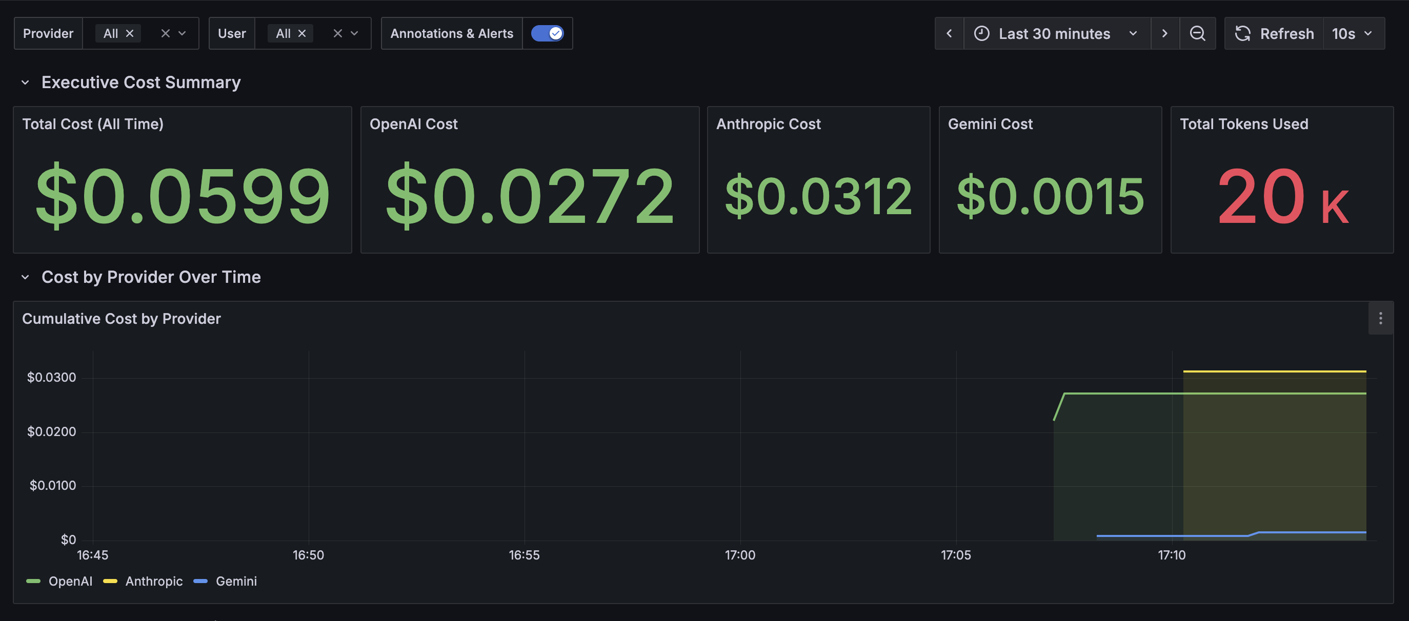 - Send cost threshold alerts by model or provider to finance or platform teams.