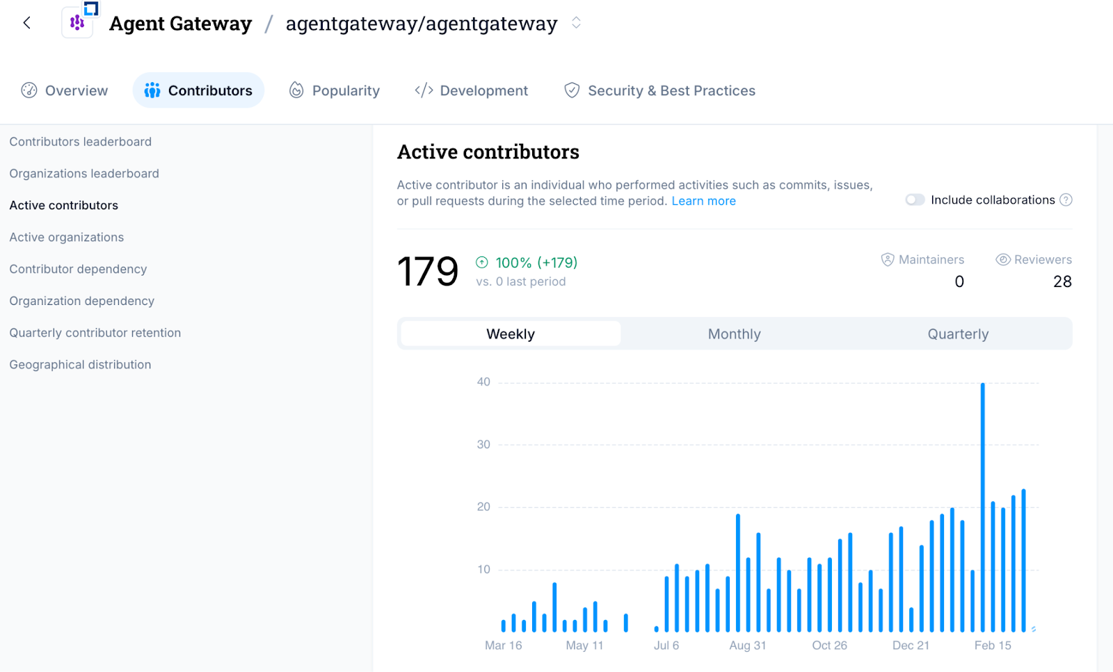 The LFX Insights provide project insight for many open source projects including agentgateway, and I was pleased to see the project currently has 179 active contributors: