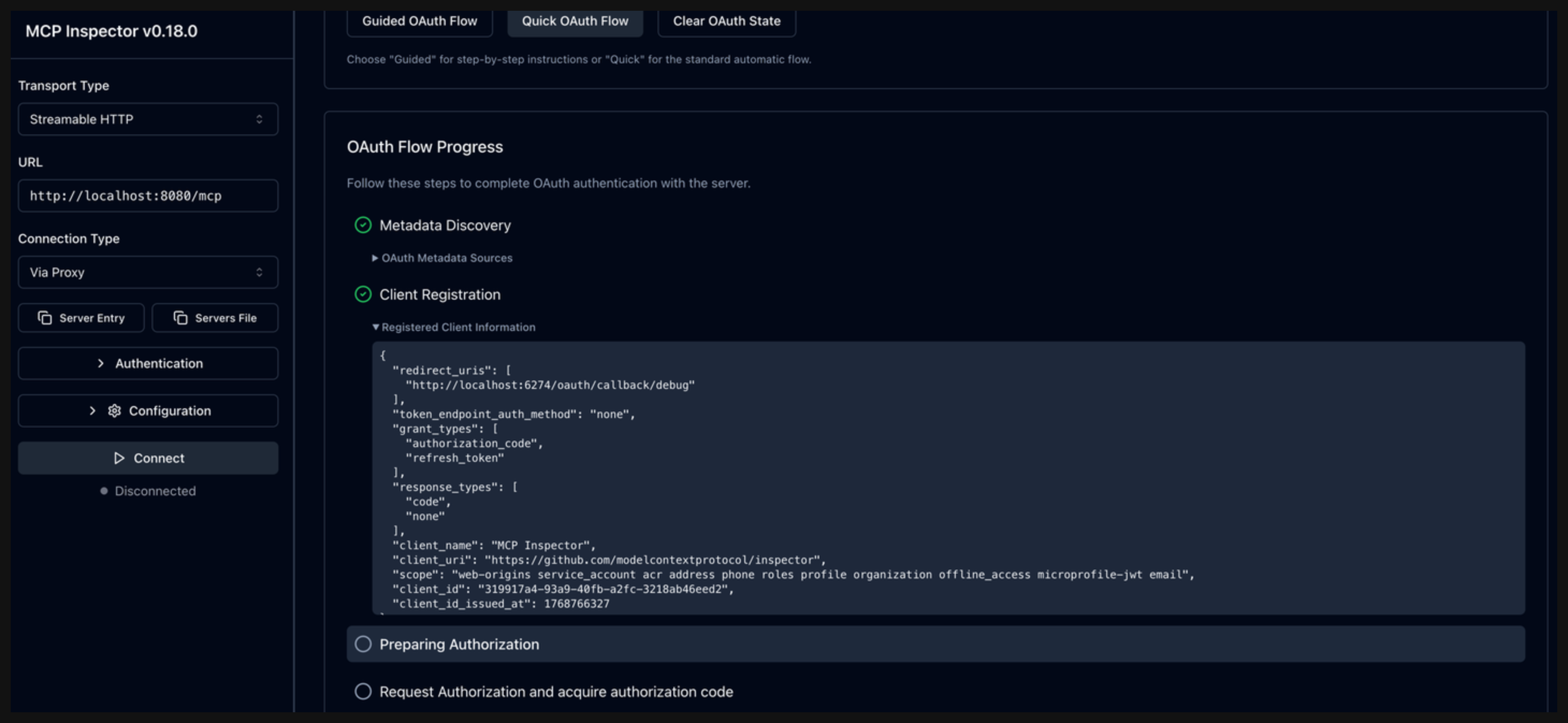 Click Continue to start the Client registration phase. Verify that the MCP inspector tool successfully registered as a client in Keycloak and is assigned a client ID.