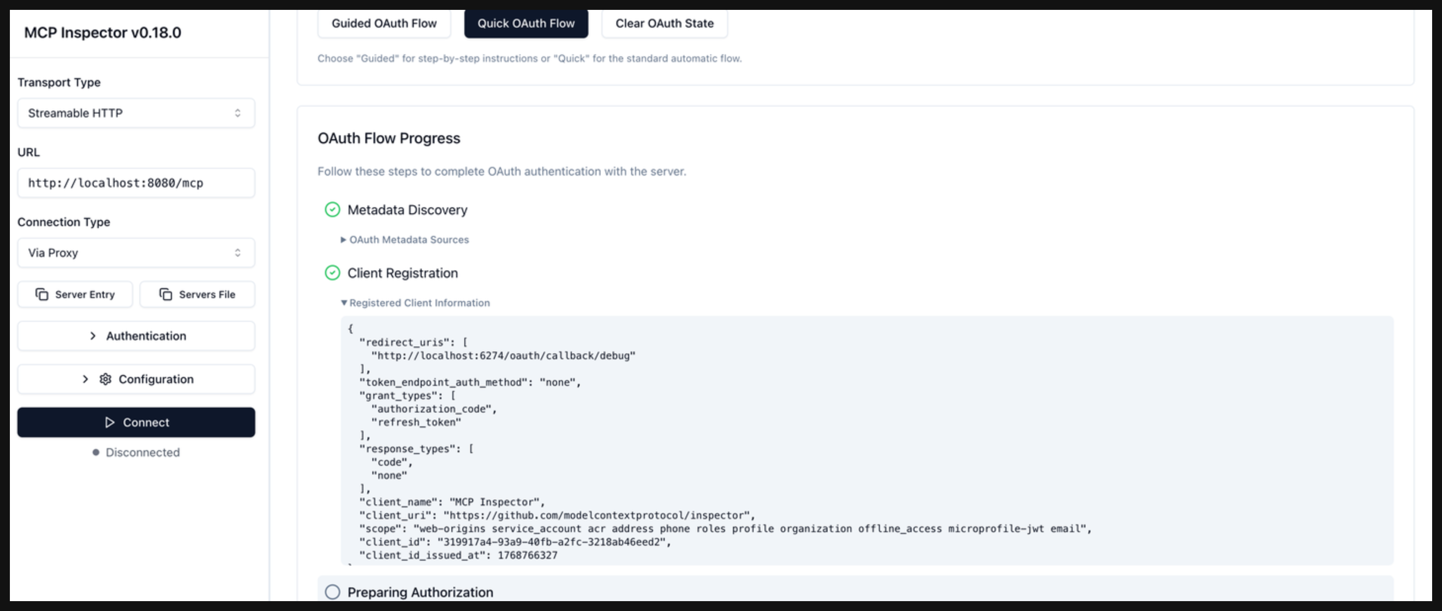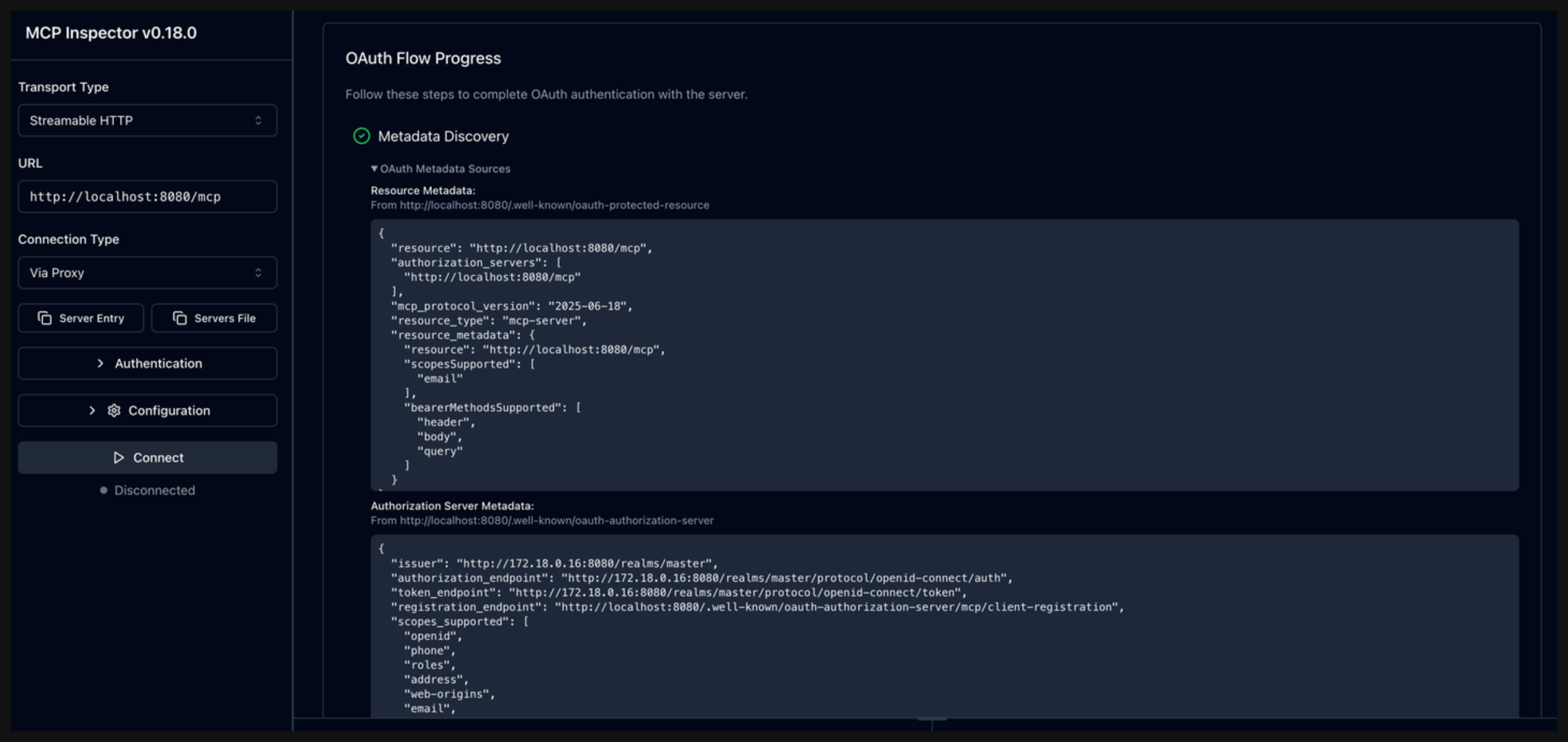 In the OAuth Flow Progress card, click Continue to start the Metadata Discovery phase. Verify that the step succeeds and that you see the authorization server metadata. The metadata include information about the location of the authorization server, supported scopes, and ways to provide the bearer token.