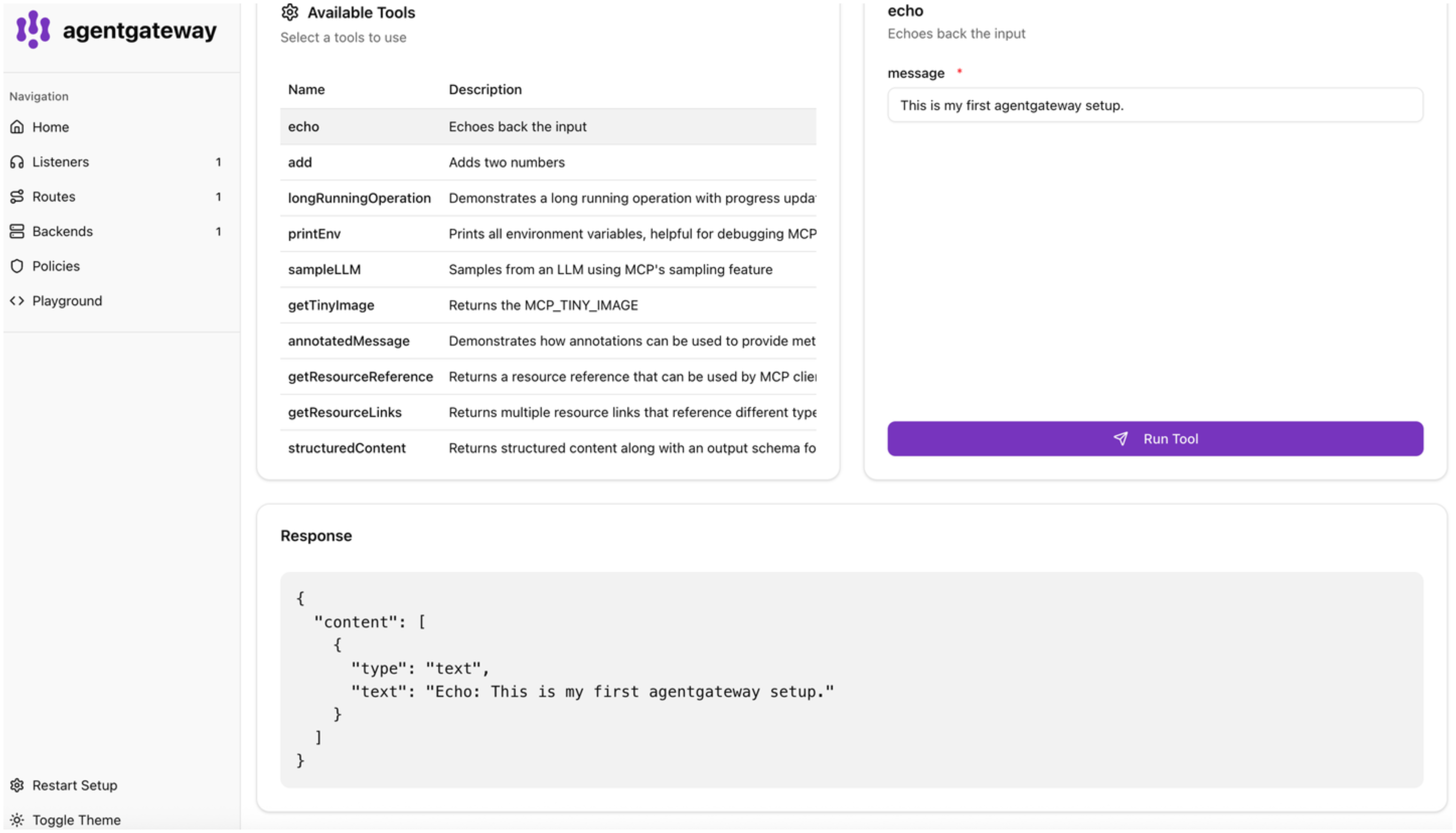 The agentgateway comes with a built-in UI that you can use to connect to your MCP target to view and access the tools that are exposed on the MCP server. You can also use the UI to review and update your listener and target configuration in-flight. Configuration updates are available immediately and do not require a restart of the agentgateway.